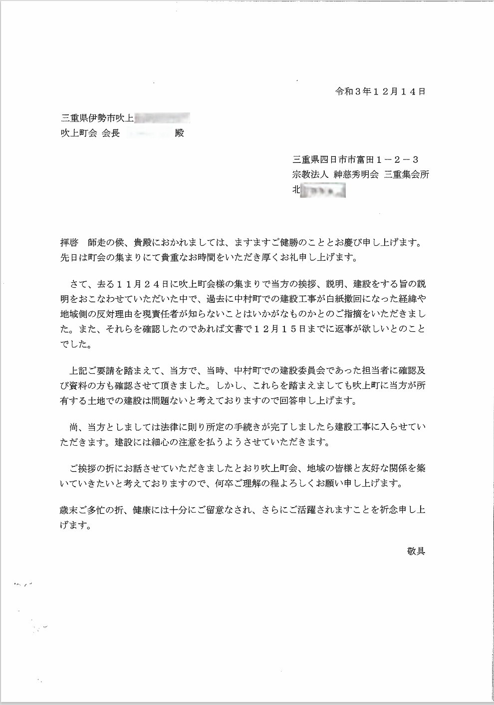 しかし神慈秀明会は、「この反対運動は一部の無理解な住民により昂揚されたもの」、「悪意のある住民運動によるものである」と代表の立場であった住民らに通知を行いました。