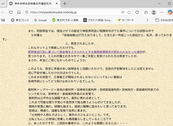 宮崎集会所建設反対HPで地元住民は、「3人の弁護士の方々の中で一番ご年配と見受けられた方の発言でしたが、まさか、本当にご存じなかったのでしょうか。」と疑問を投げています。